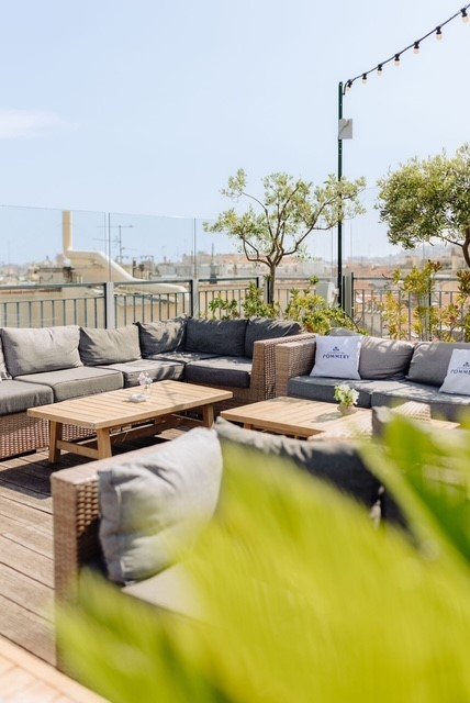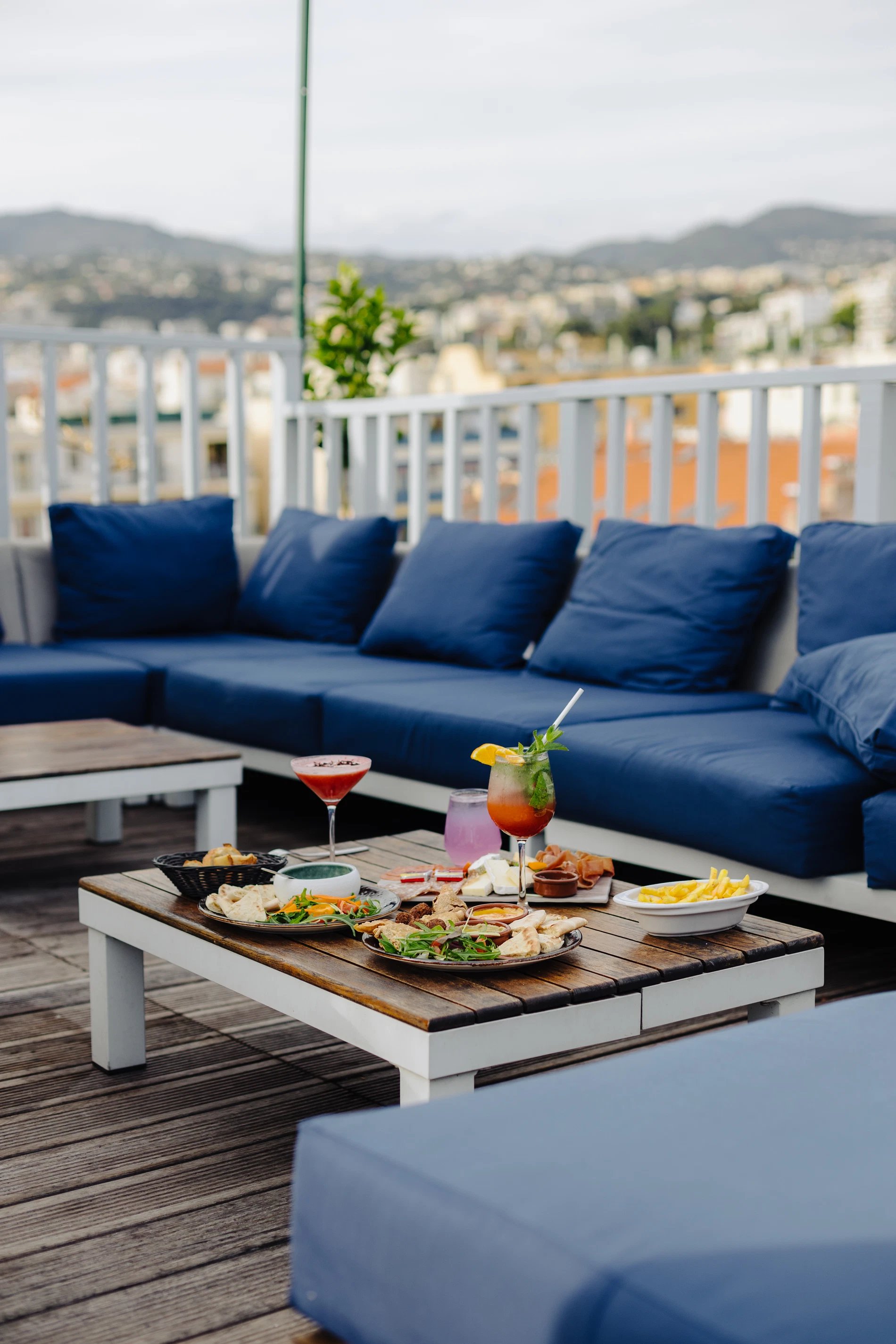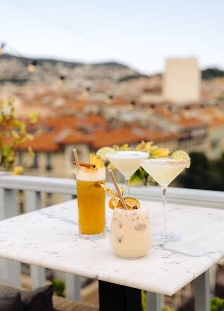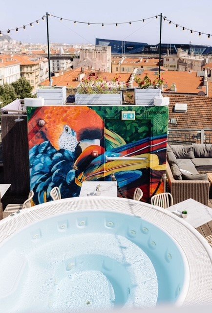Das Rooftop ist die Dachterrassen-Bar im 7. Stock des Hotel Monsigny – mitten in der Innenstadt von Nizza in der Fußgängerzone Malaussena mit einem außergewöhnlichen Panorama-Rundblick auf Nizza, das Mittelmeer und die umliegenden Hügel.